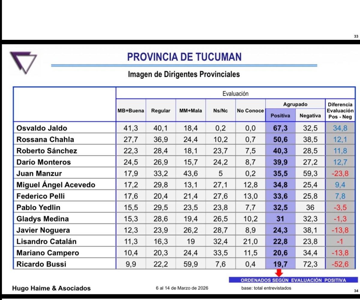 Con una imagen negativa del 72,3%, el legislador Ricardo Bussi aparece hoy como el dirigente con peor valoración pública en Tucumán, según una encuesta reciente de Hugo Haime. El dato lo ubica incluso al nivel de las figuras nacionales más rechazadas del escenario político argentino, como Sergio Massa (-71%) y Máximo Kirchner (-72%), y marca un escenario complejo para cualquier intento de reconstrucción electoral.