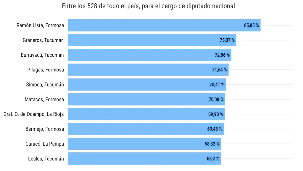 En el ranking, luego, se ubica el municipio formoseño de Pilagás, en el que el Frente de la Victoria cosechó 71,64%, y casi triplicó a LLA (25,17%); seguido de Simoca, donde el peronismo tucumano se impuso por 70,41% contra 19,33 de la lista violeta; y Matacos, también en Formosa, en el que el peronismo sacó el 70% que recogió el contra 27% de los libertarios.